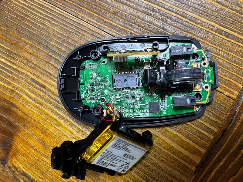 배터리와 휠을 고정하고 있는 나사를 제거하고 기판을 하판에 고정시키고 있는 나사도 제거해주고 나면 아래처럼 기판이 분리가 됩니다. 기판을 뒤집어놓은 모습입니다.
